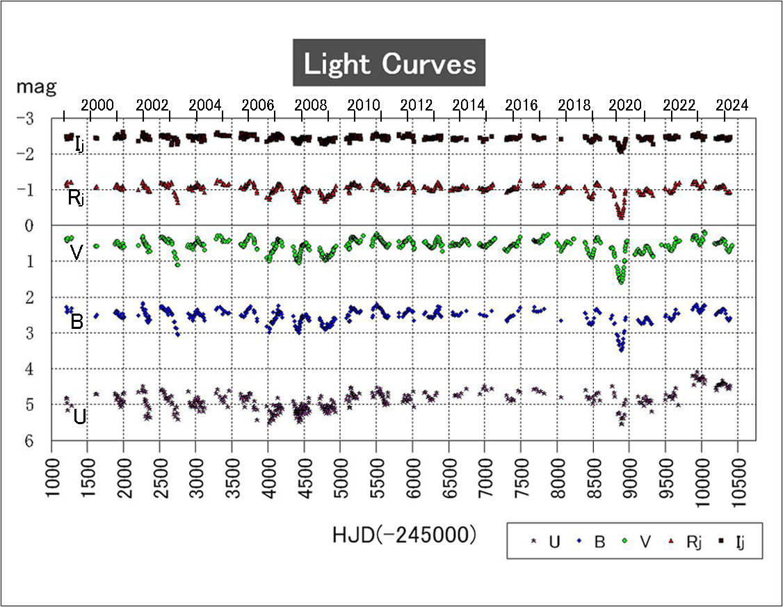 をとって観測誤差とすると,1999年以降の平均値はV等級で0.0146等U-Bではこの約2倍他のバンドはVと